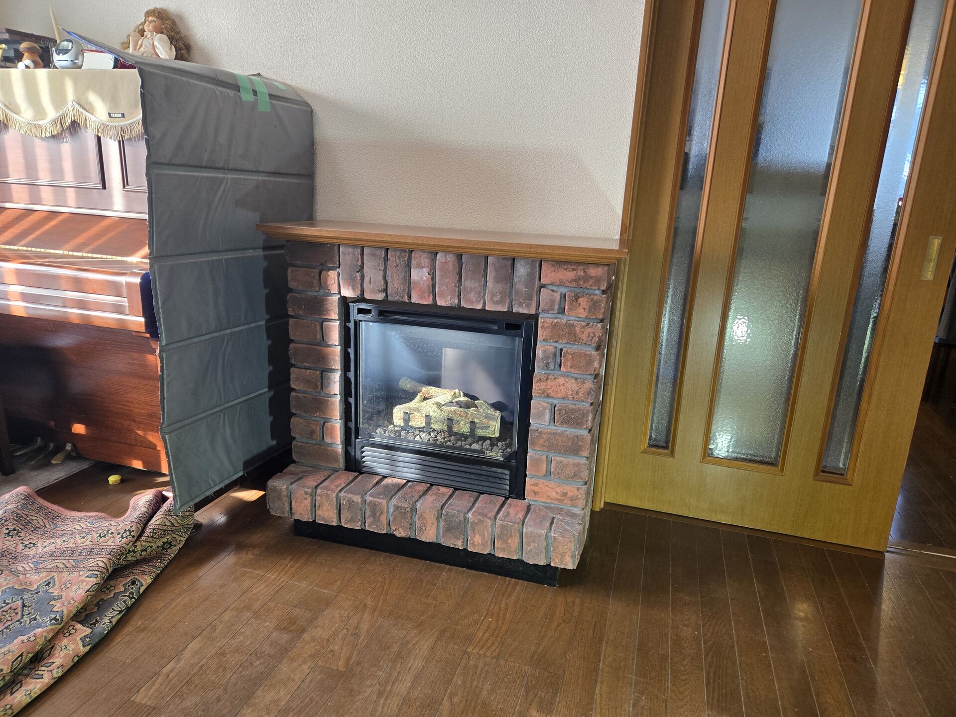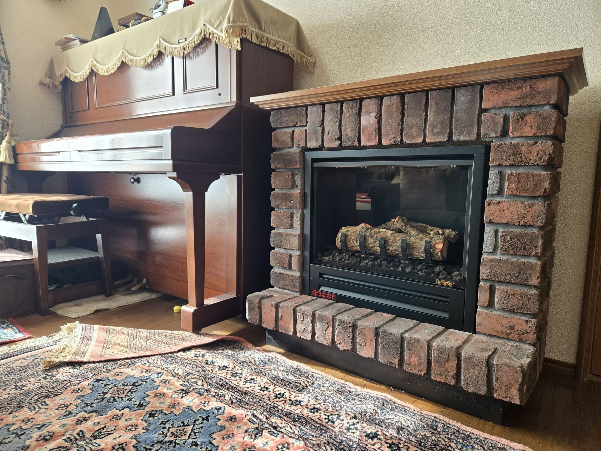 木目のピアノと、レンガのマントルピースに入ったガス暖炉